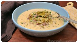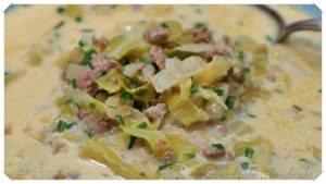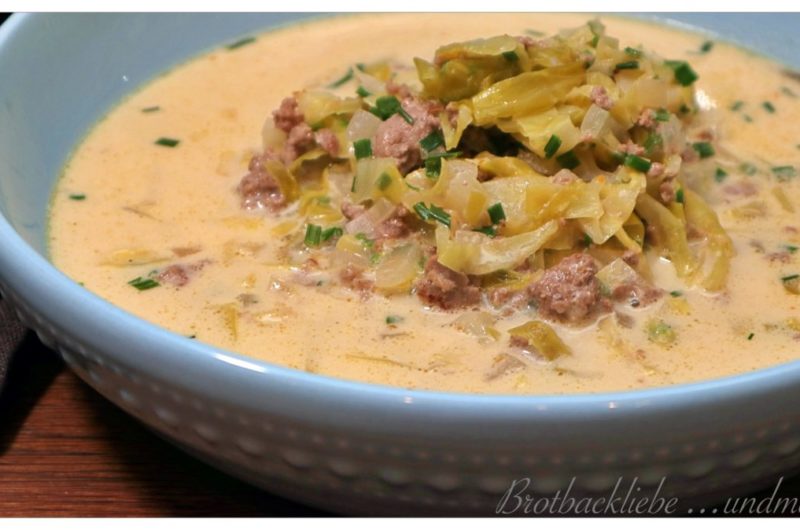 Auf diesen Eintopf in ich gekommen, da ich noch einen Spitzkohl im Kühlschrank hatte. Eigentlich wollte ich einen Krautsalat damit machen, habe aber dann doch ganz was anderes gekocht. Angelehnt an die Käse-Lauch-Suppe im Blog habe ich zusammen mit Hackfleisch einen sehr leckeren Eintopf daraus gemacht – eigentlich sogar Low Carb, also ohne Kohlenhydrate. Wir haben kein Brot dazu gebraucht, er macht auch so satt. Gut würden aber auch Kartoffeln dazu passen, die einfach in Würfeln mitgekocht werden können.
