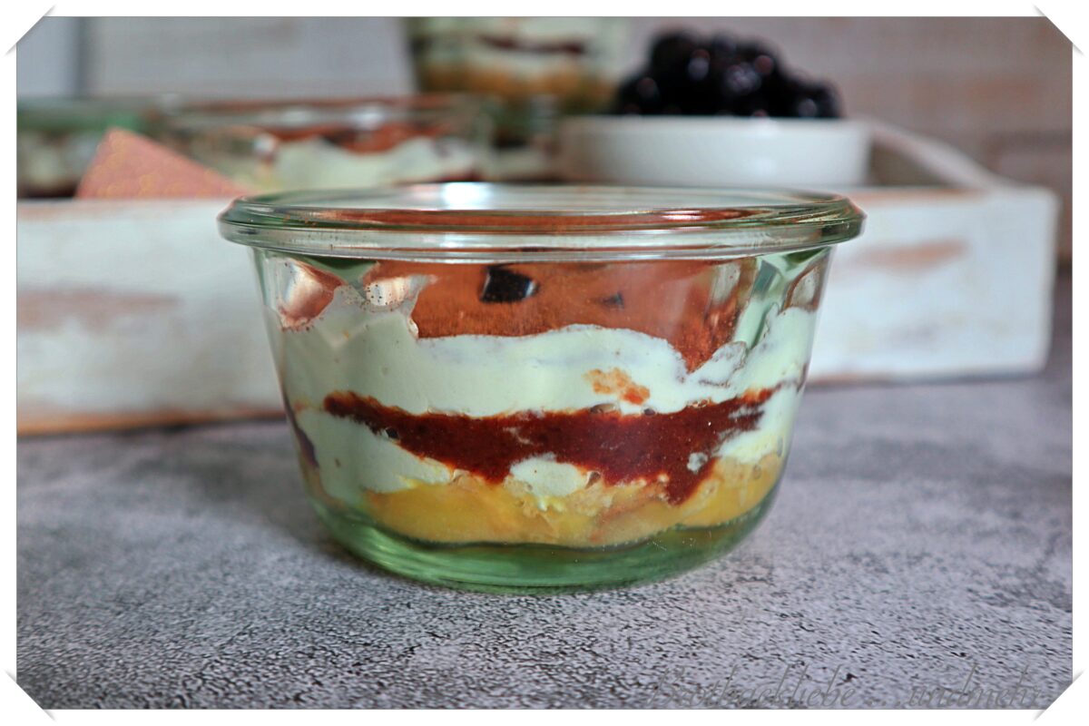 - Sahne steifschlagen. Quark, Mascarpone, Vanillezucker, Puderzucker und Zitronenschale zu einer glatten Masse verrühren. Sahne unterheben. Die Hälfte der Masse in die Gläser geben und mit einem Teelöffel etwas glattstreichen.