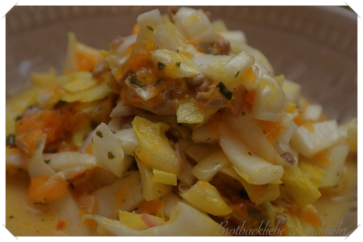 Bei uns gibt es zu den meisten Mahlzeiten Salat – sehr oft grüner Salat mit verschiedenen Zutaten. Aber oft auch andere Salate wie dieser Chicoreesalat. Mit Mandarinen und Sonnenblumenkernen passt er eigentlich immer und zu allem und ist schnell gemacht.
